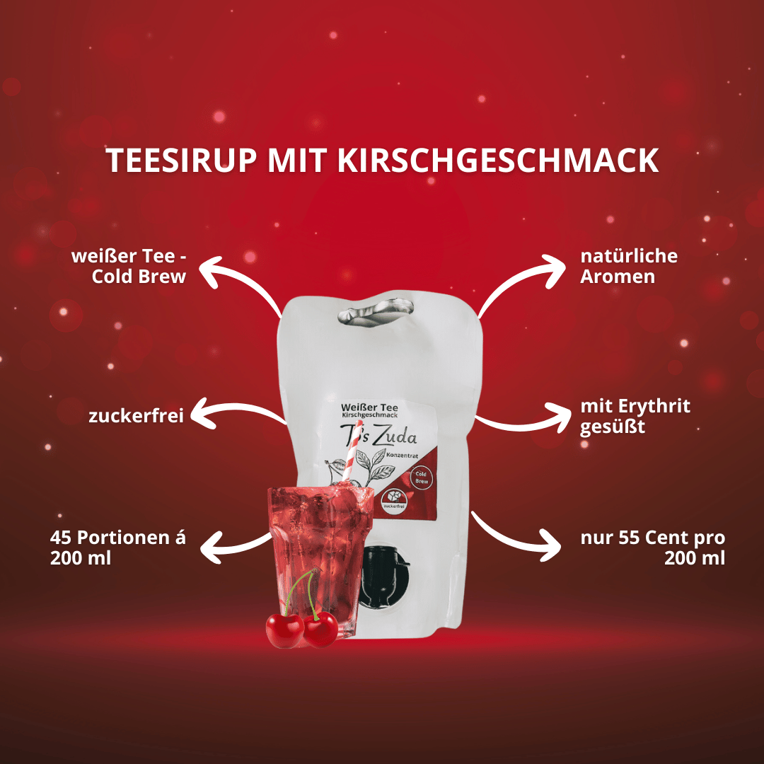 Konzentrat zur Herstellung eines Erfrischungsgetränks auf Basis von kalt aufgegossenem weißem Tee. Kirschgeschmack. Mit Süßungsmitteln.