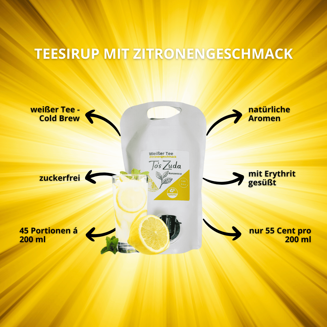 Konzentrat zur Herstellung eines Erfrischungsgetränks auf Basis von kalt aufgegossenem weißem Tee. Zitronengeschmack. Mit Süßungsmitteln.